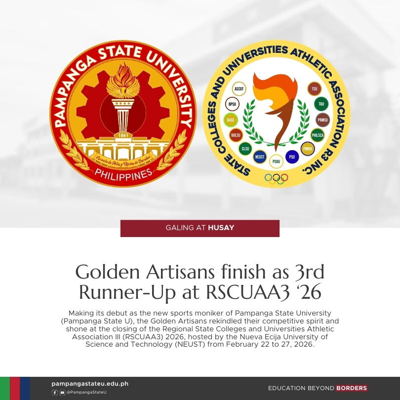 Making its debut as the new sports moniker of Pampanga State University (Pampanga State U), the Golden Artisans rekindled their competitive spirit and shone at the closing of the Regional State Colleges and Universities Athletic Association III (RSCUAA3) 2026, hosted by the Nueva Ecija University of Science and Technology (NEUST) from February 22 to 27, 2026.