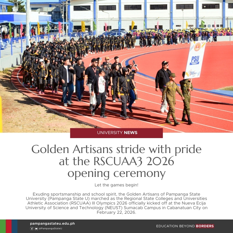 Exuding sportsmanship and school spirit, the Golden Artisans of Pampanga State University (Pampanga State U) marched as the Regional State Colleges and Universities Athletic Association (RSCUAA) III Olympics 2026 officially kicked off at the Nueva Ecija University of Science and Technology (NEUST) Sumacab Campus in Cabanatuan City on February 22, 2026.