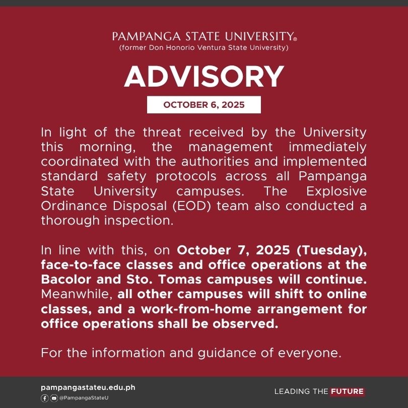 Due to the scheduled power interruption in select barangays of Bacolor, Pampanga, classes will be conducted through online learning mode on September 17, 2024 (Tuesday). Meanwhile, offices will continue to operate on-site. Please note that this advisory is applicable to the Bacolor (Main) Campus only.