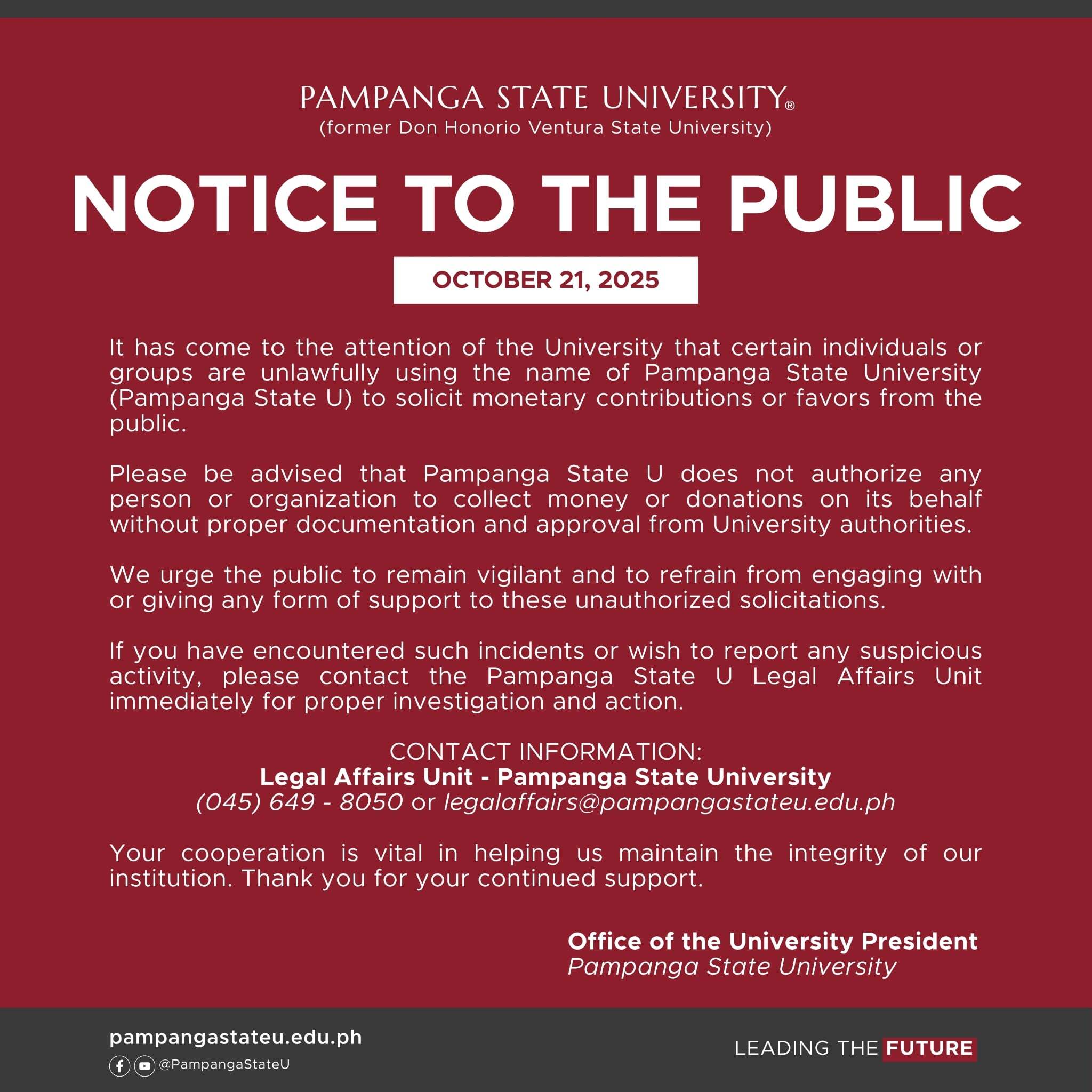 𝐀𝐃𝐕𝐈𝐒𝐎𝐑𝐘 | The Don Honorio Ventura State University (DHVSU) has received reports that unscrupulous persons are misrepresenting offices and personnel of the university and are asking for favors, solicitations, borrowing money, or job offerings.
