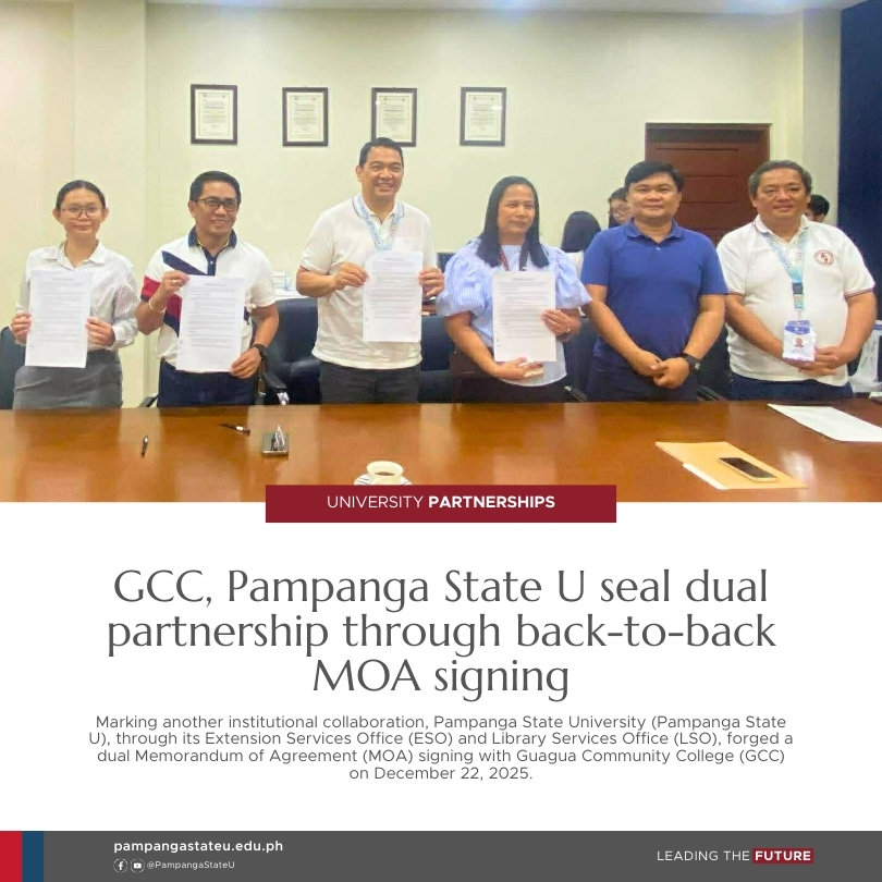 Marking another institutional collaboration, Pampanga State University (Pampanga State U), through its Extension Services Office (ESO) and Library Services Office (LSO), forged a dual Memorandum of Agreement (MOA) signing with Guagua Community College (GCC) on December 22, 2025.