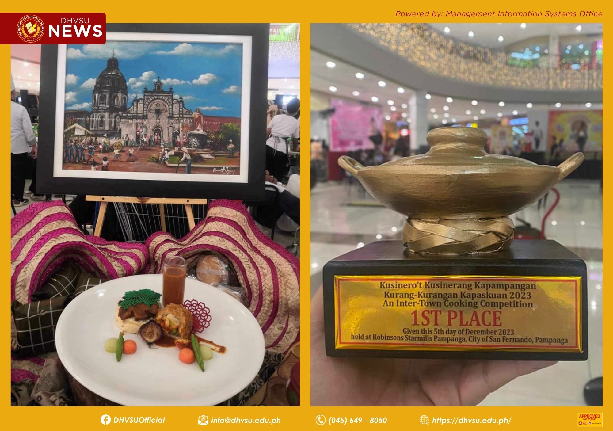 Proving their excellence and expertise in culinary skills, three students from the College of Hospitality and Tourism Management at DHVSU secured first place at the Kusinero’t Kusinerang Kapampangan Kurang-Kurangan Kapaskuhan 2023: An Inter-Town Cooking Competition held at Robinsons Starmills, Pampanga on December 5.