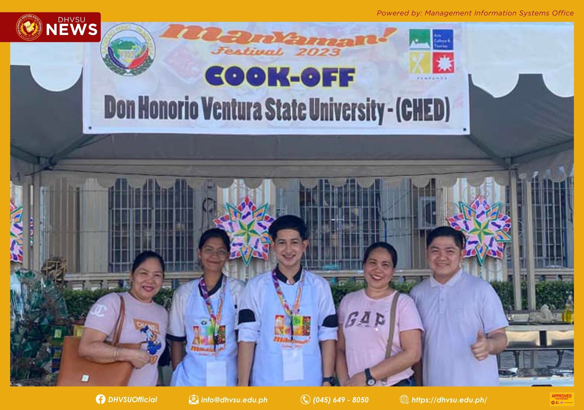 In another event, Kyla Cammille B. Dela Cruz and Joshua G. Carbungco, along with their coaches Mr. Mike Haizon M. David, Mr. Alfer S. Sanchez, Ms. Diana D. Ocampo, and Ms. Rowena L. Pamintuan, also represented DHVSU at the 1st Manyaman Festival held at the Capitol Grounds, City of San Fernando, Pampanga.