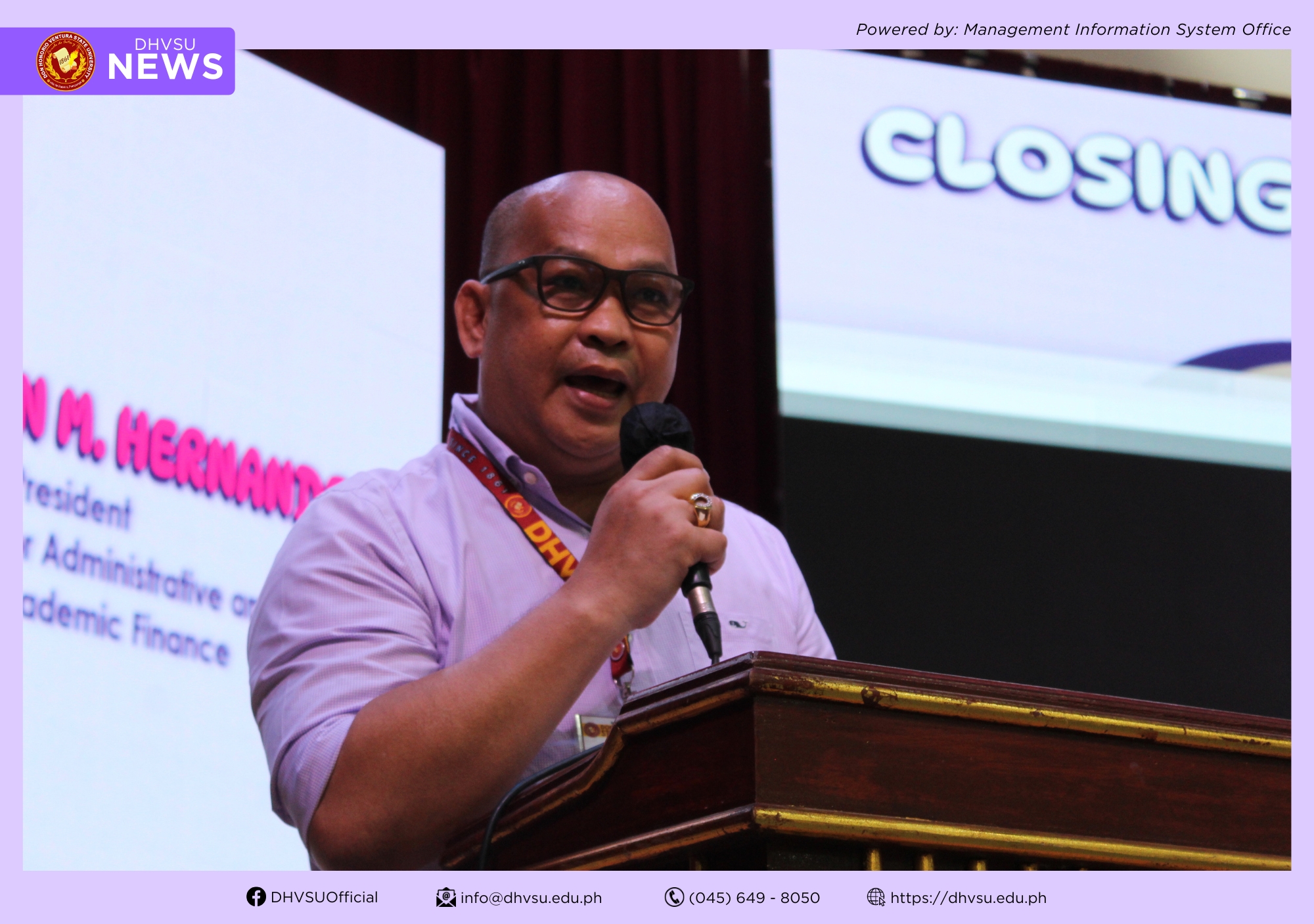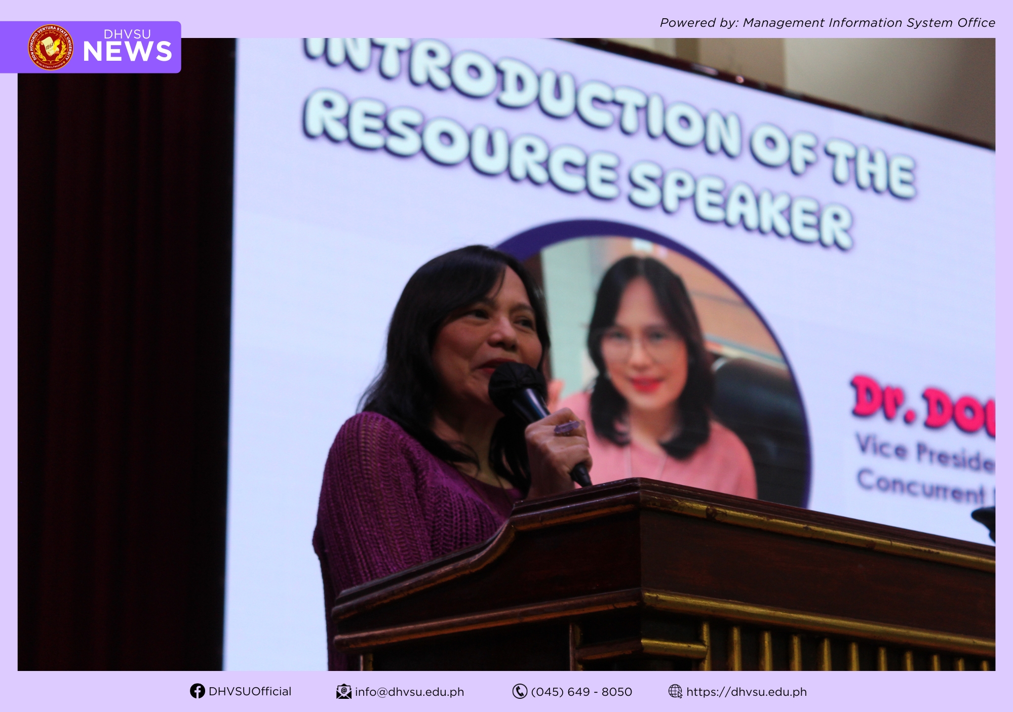The event was attended by GAD focal persons from various DHVSU units and offices, members of the administrative council, faculty, non-teaching staff, students, and top university management, including University President Dr. Enrique G. Baking; Vice President for Academic Affairs, concurrent OICExecutive Vice President, and OIC-Vice President for Administration and Finance, Engr. Reden M. Hernandez; and Vice President for Student Affairs and Services, concurrent Dean of the Graduate School and GFPS Director, Dr. Dolores T. Quiambao.