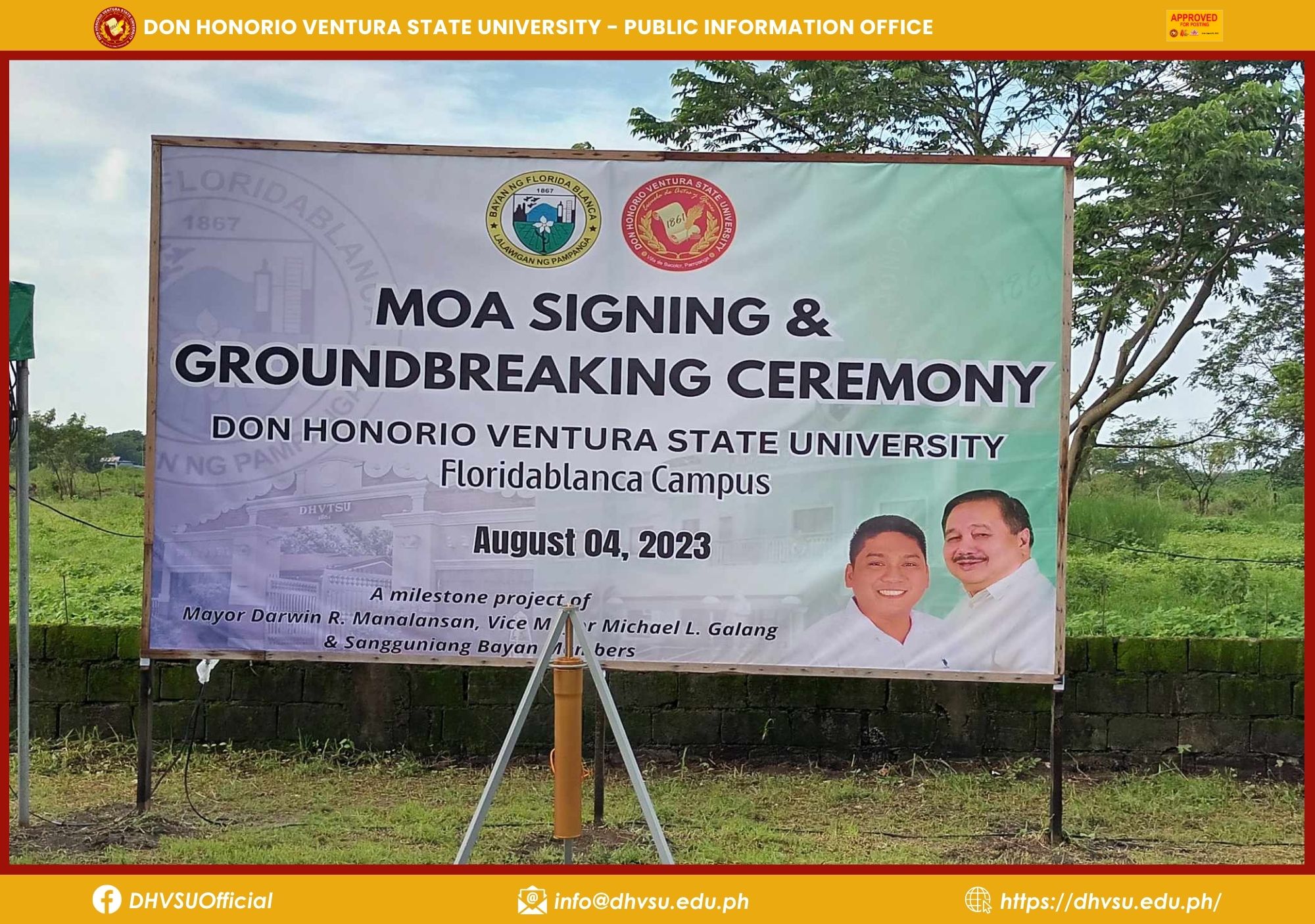 DHVSU, Municipality of Floridablanca sign agreement and break ground for new campus August 4, 2023 - The Don Honorio Ventura State University (DHVSU) and the Municipality of Floridablanca formalized their partnership through the signing of a Memorandum of Agreement (MOA) for the establishment of a new DHVSU campus in Barangay Consuelo Floridablanca, Pampanga.