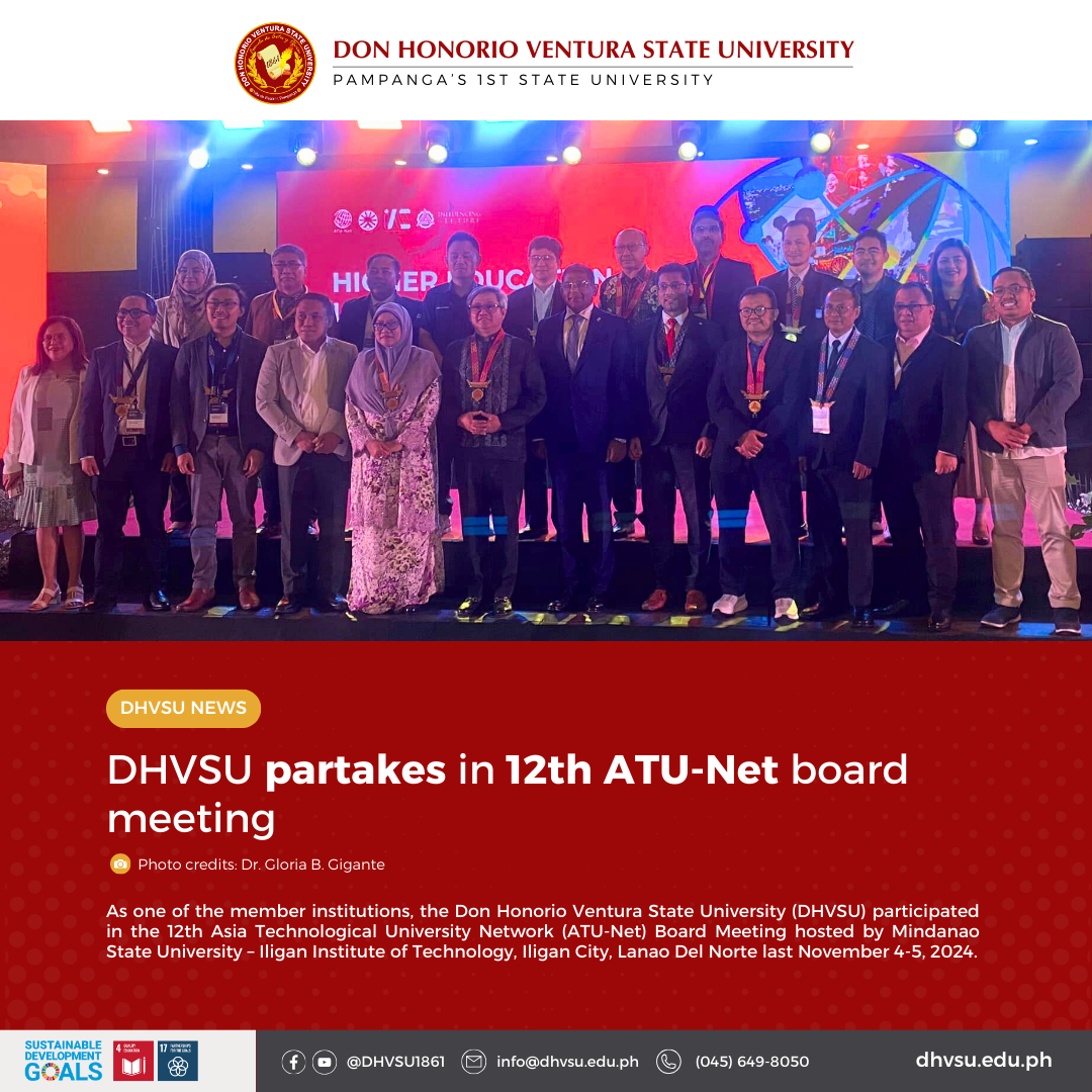As one of the member institutions, the Don Honorio Ventura State University (DHVSU) participated in the 12th Asia Technological University Network (ATU-Net) Board Meeting hosted by Mindanao State University – Iligan Institute of Technology, Iligan City, Lanao Del Norte last November 4-5, 2024.