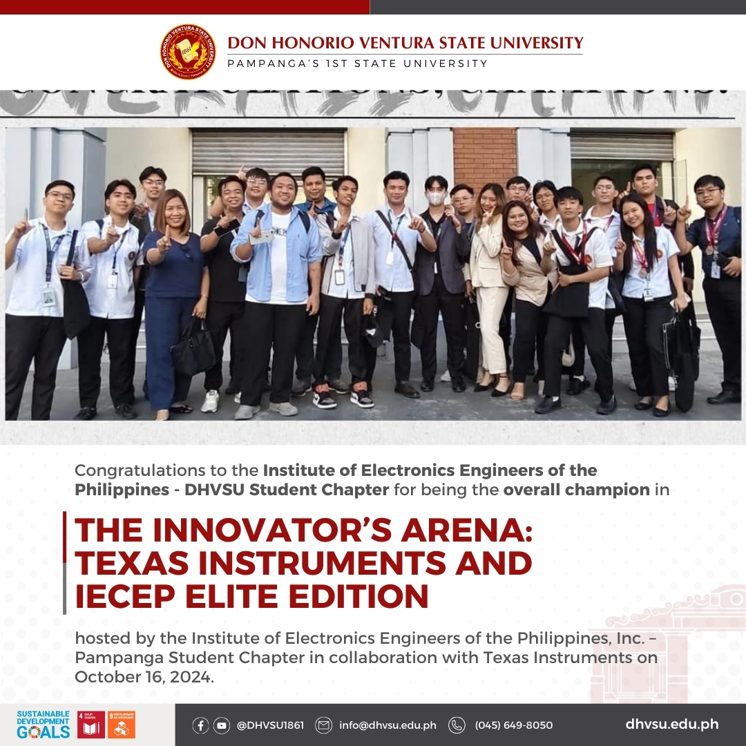 The Bachelor of Science in Electronics Engineering students of Don Honorio Ventura State University (DHVSU) finished off as overall champion in The Innovator’s Arena: Texas Instruments and IECEP Elite Edition, hosted by the Institute of Electronics Engineers of the Philippines, Inc. – Pampanga Student Chapter in collaboration with Texas Instruments on October 16, 2024.