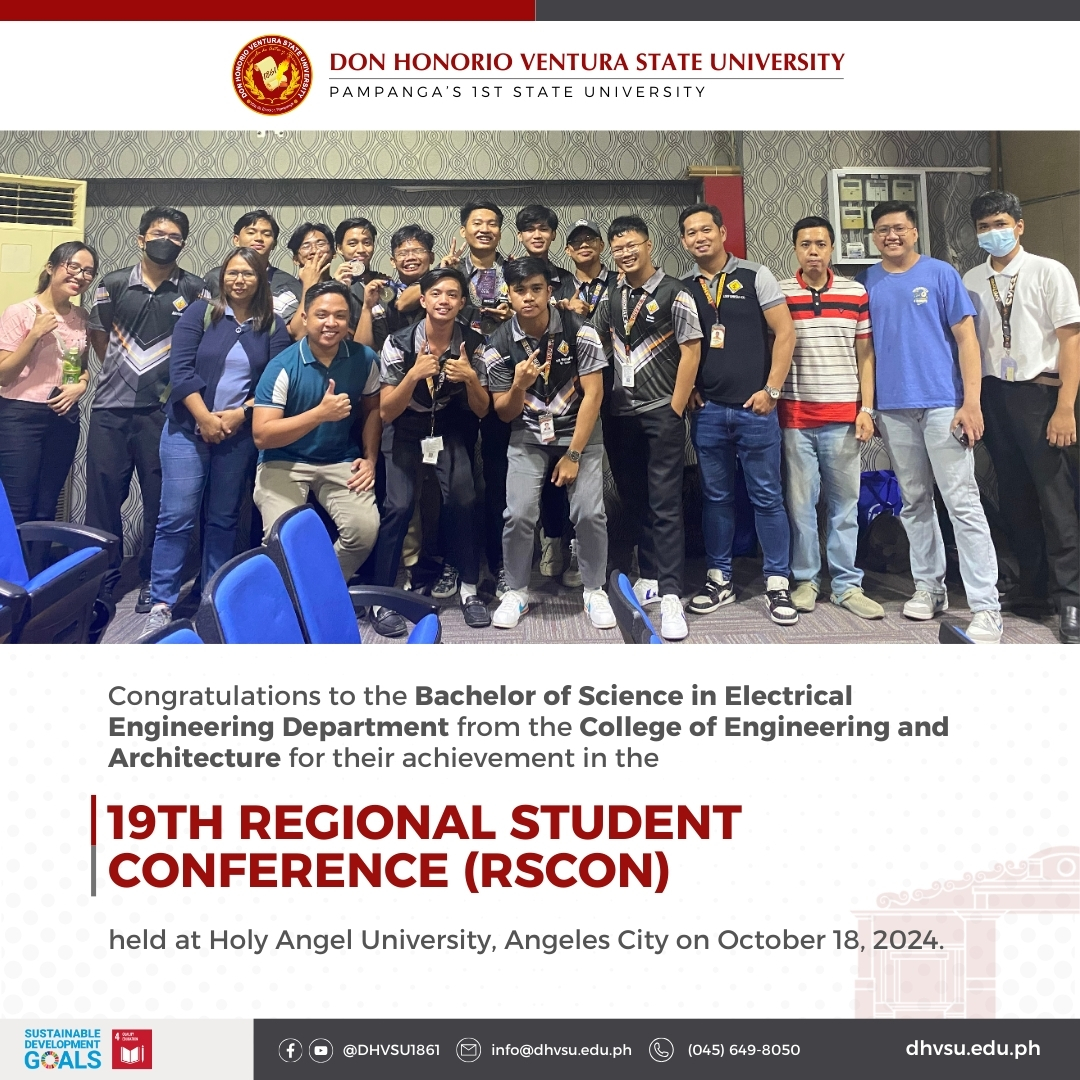 Two teams of students from the Bachelor of Science in Electrical Engineering (BSEE) department waved the flag of Don Honorio Ventura State University (DHVSU), securing placements in two different events during the 19th Regional Student Conference (RSCon), held at Holy Angel University in Angeles City on October 18, 2024.