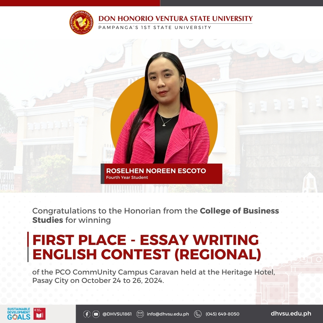 Roselhen Noreen Escoto, a fourth-year student from the College of Business Studies, won First Place in the English Essay Writing Contest (Regional) during the Presidential Communications Office (PCO) CommUnity Campus Caravan, held at the Heritage Hotel in Pasay City from October 24 to 26, 2024.