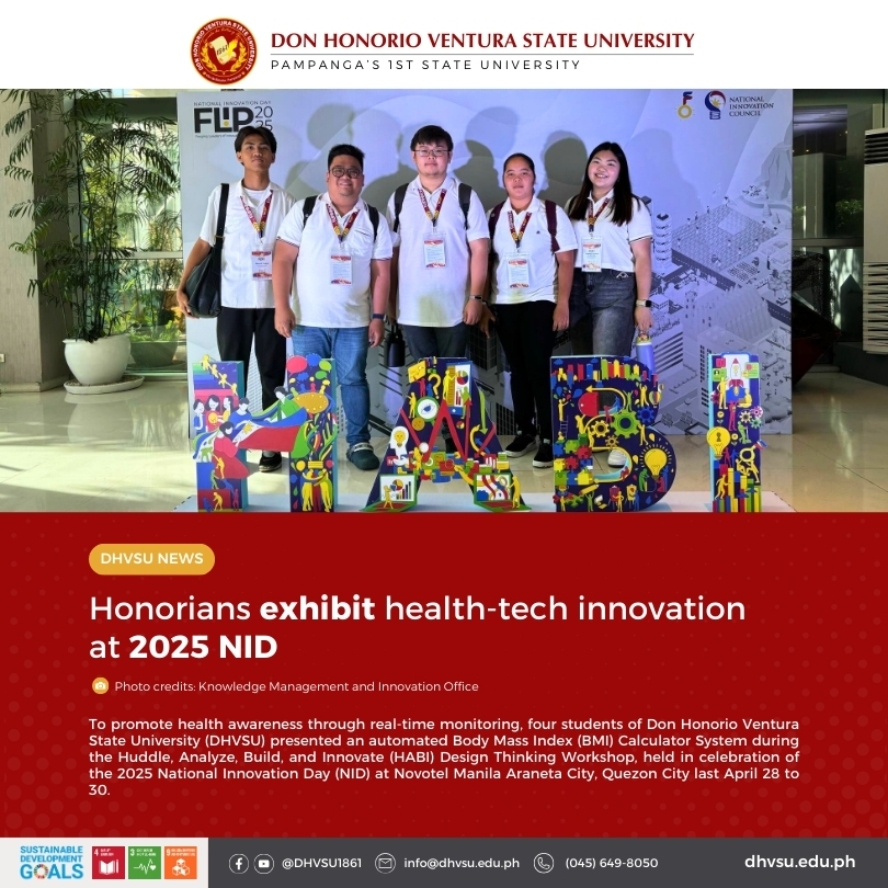 To promote health awareness through real-time monitoring, four students of Don Honorio Ventura State University (DHVSU) presented an automated Body Mass Index (BMI) Calculator System during the Huddle, Analyze, Build, and Innovate (HABI) Design Thinking Workshop, held in celebration of the 2025 National Innovation Day (NID) at Novotel Manila Araneta City, Quezon City last April 28 to 30.