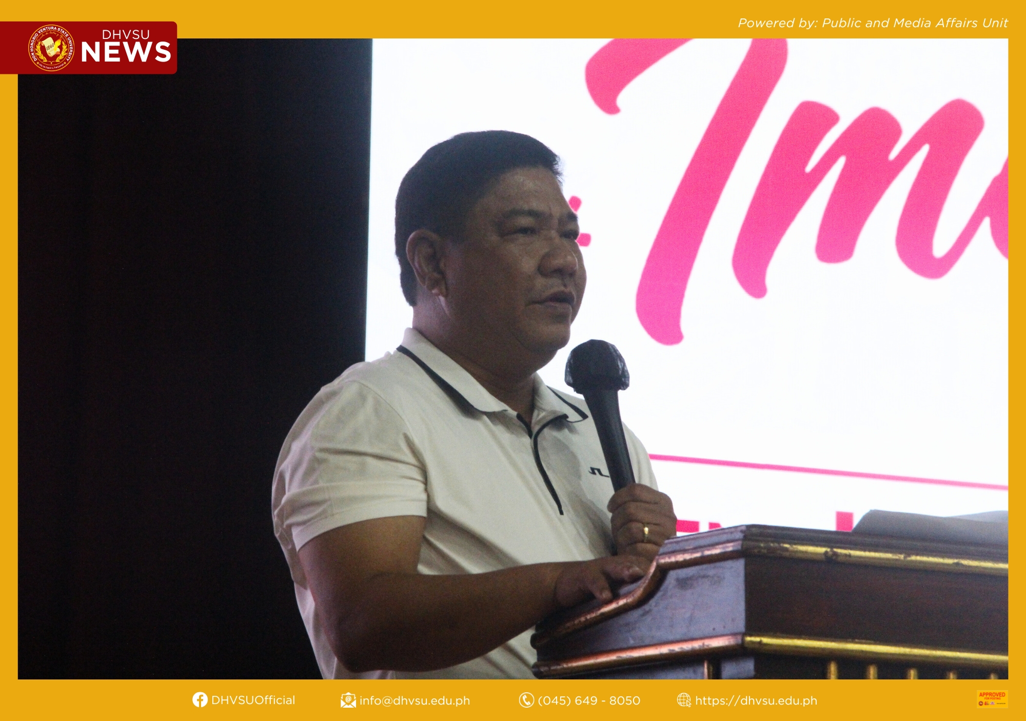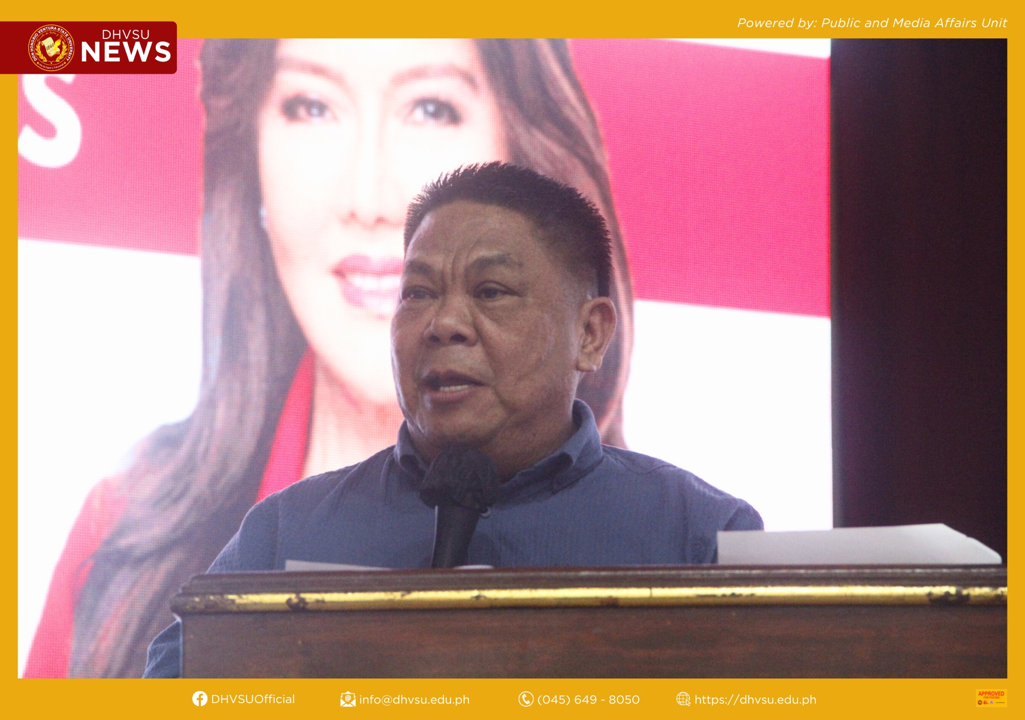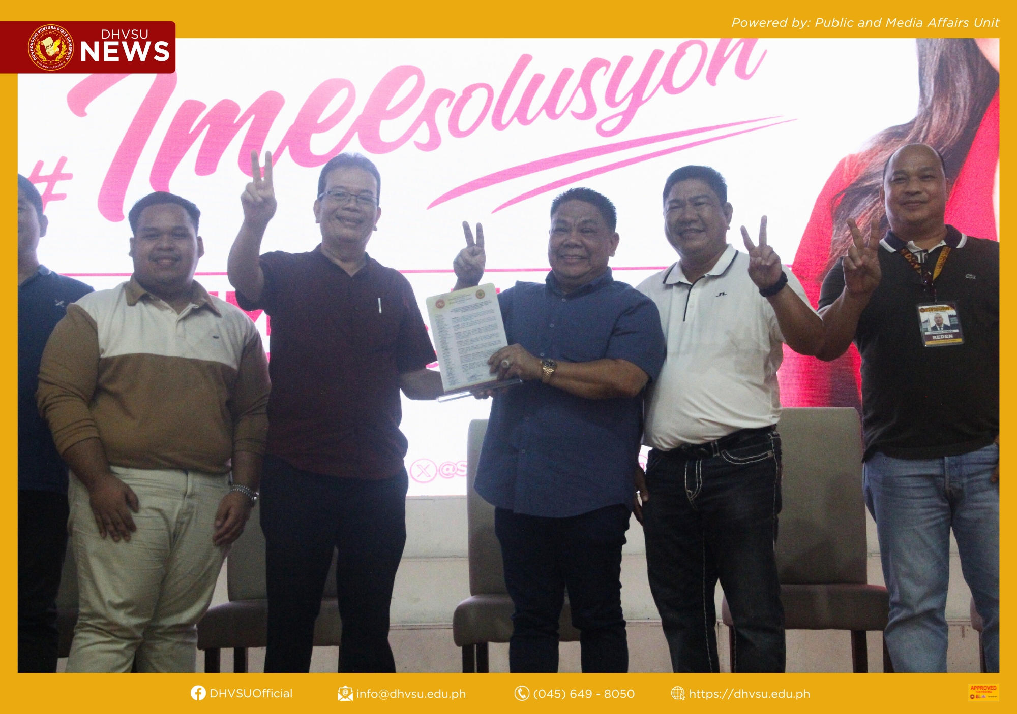 Furthermore, the awarding of a certificate of recognition to Sen. Imee Marcos was headed by Dr. Enrique G. Baking, University President; Engr. Reden M. Hernandez, Vice President for Academic Affairs, concurrent OIC Executive Vice President and OIC-Vice President for Administration and Finance; Dr. Ranie B. Canlas, Vice President for Research, Innovation, Training & Extension Services; Dr. Dolores T. Quiambao, Vice President for Student Affairs and Services and concurrent Dean, Graduate School; and Paul Andrei M. Macaspac, University Student Council President of DHVSU.