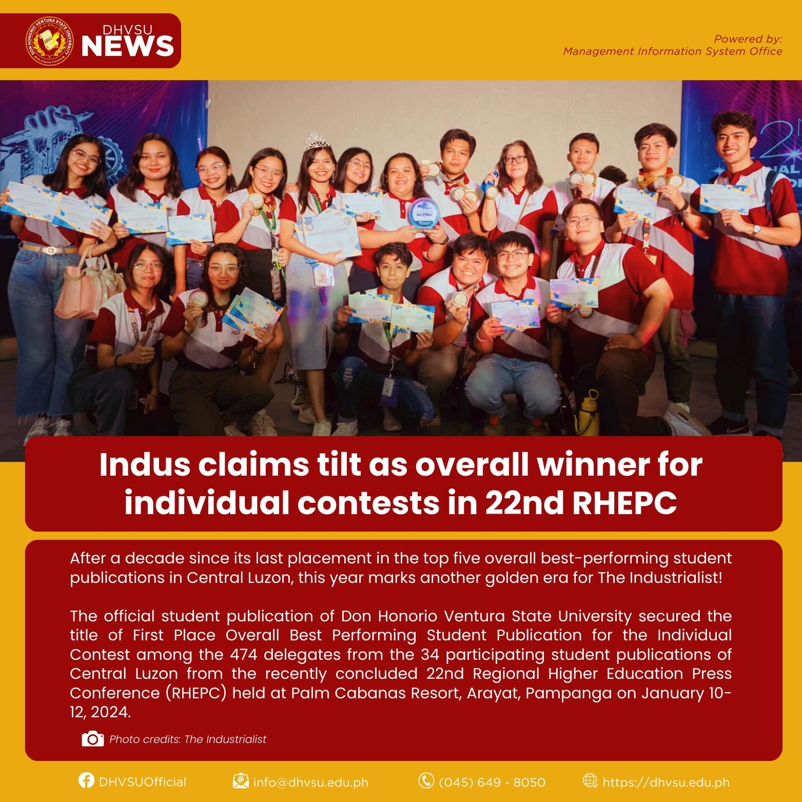 The official student publication of Don Honorio Ventura State University secured the title of First Place Overall Best Performing Student Publication for the Individual Contest among the 474 delegates from the 34 participating student publications of Central Luzon from the recently concluded 22nd Regional Higher Education Press Conference (RHEPC) held at Palm Cabanas Resort, Arayat, Pampanga on January 10-12, 2024.