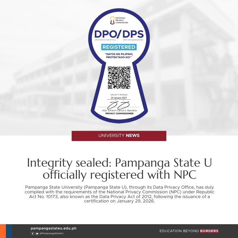 Pampanga State University (Pampanga State U), through its Data Privacy Office, has duly complied with the requirements of the National Privacy Commission (NPC) under Republic Act No. 10173, also known as the Data Privacy Act of 2012, following the issuance of a certification on January 29, 2026.