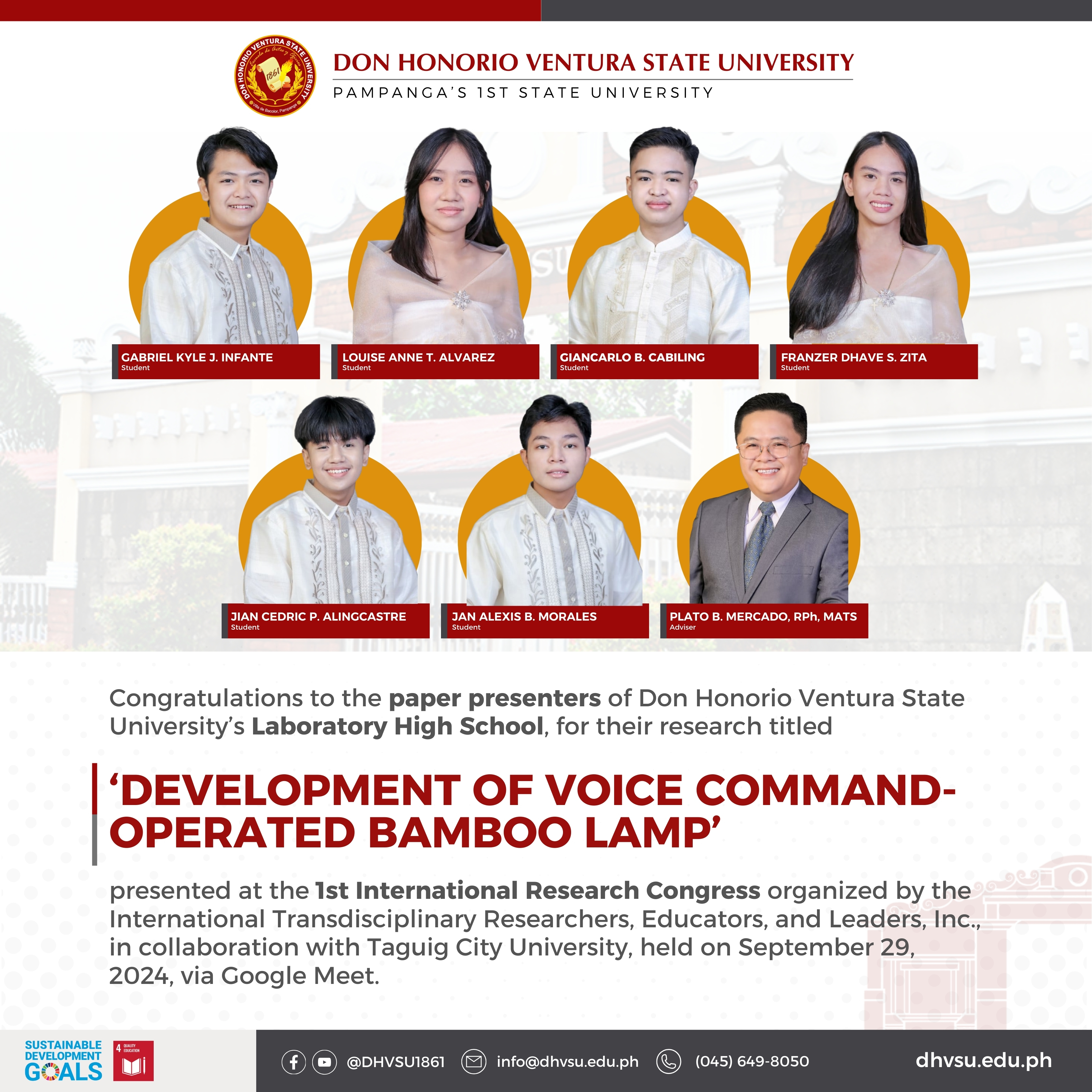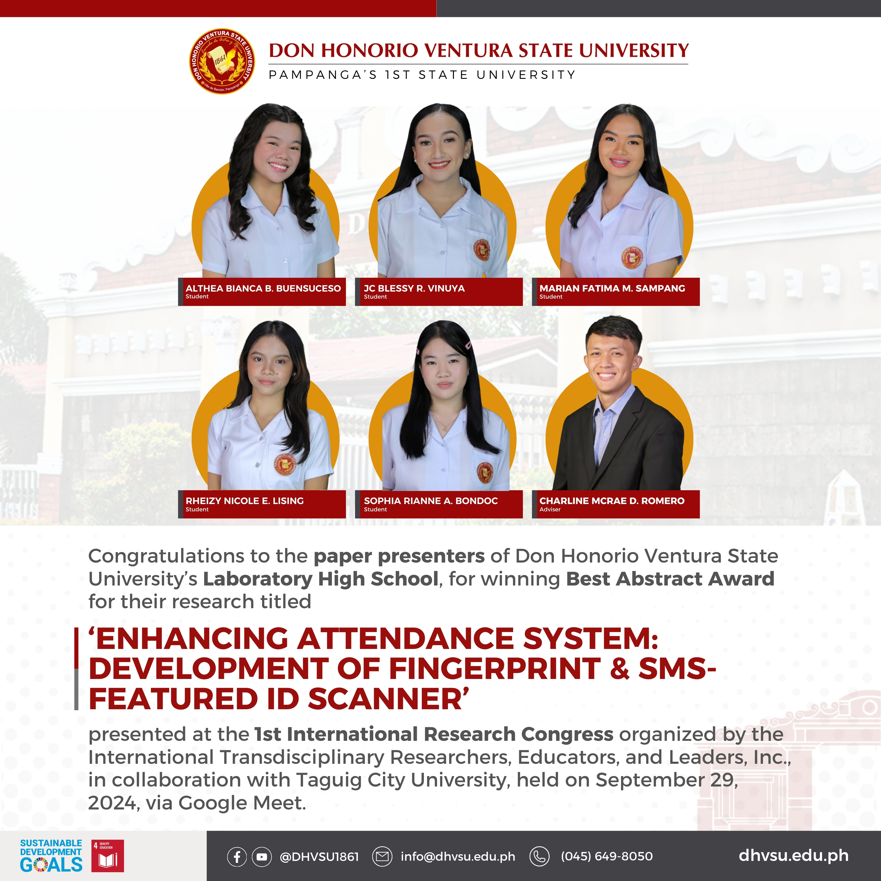 Student researchers from Don Honorio Ventura State University – Laboratory High School (LHS) successfully presented their work and won an award at the 1st International Research Congress, organized by the International Transdisciplinary Researchers, Educators, and Leaders, Inc., in collaboration with Taguig City University on September 29, 2024, via Google Meet.