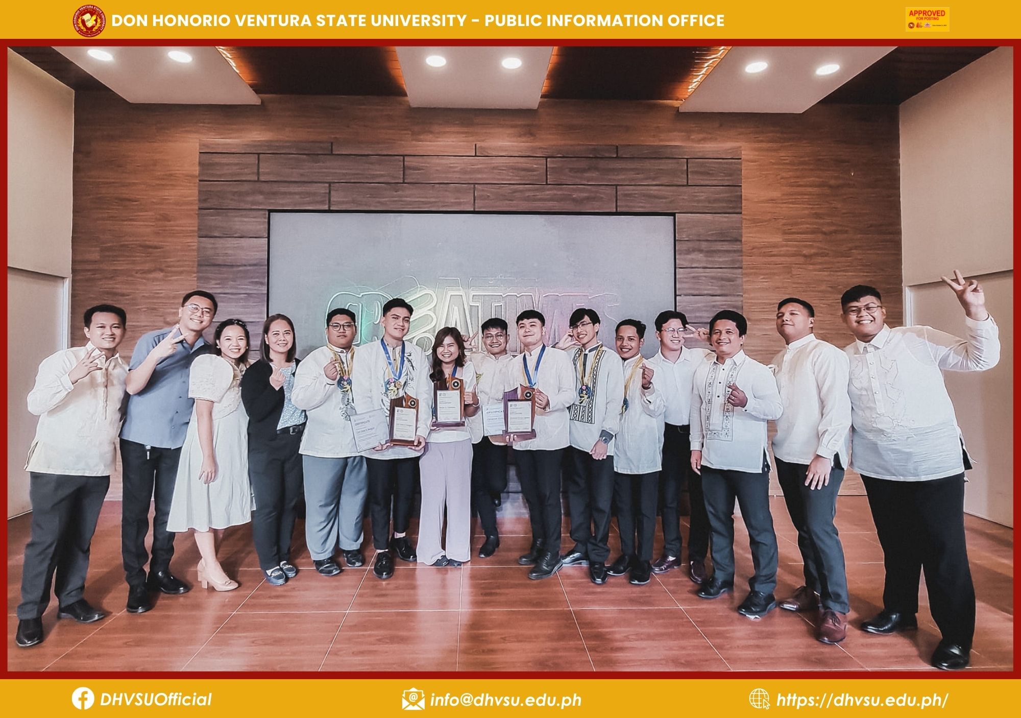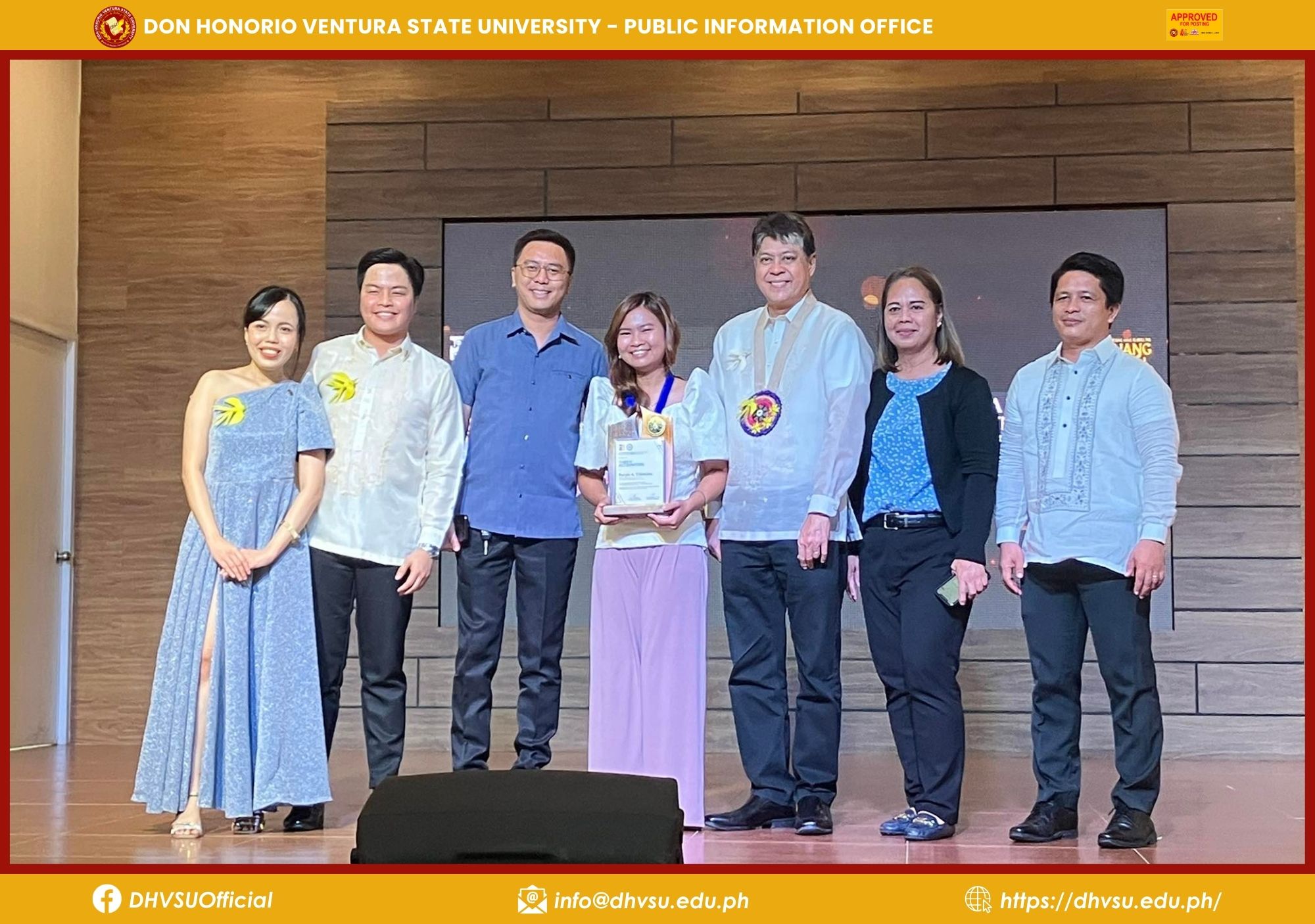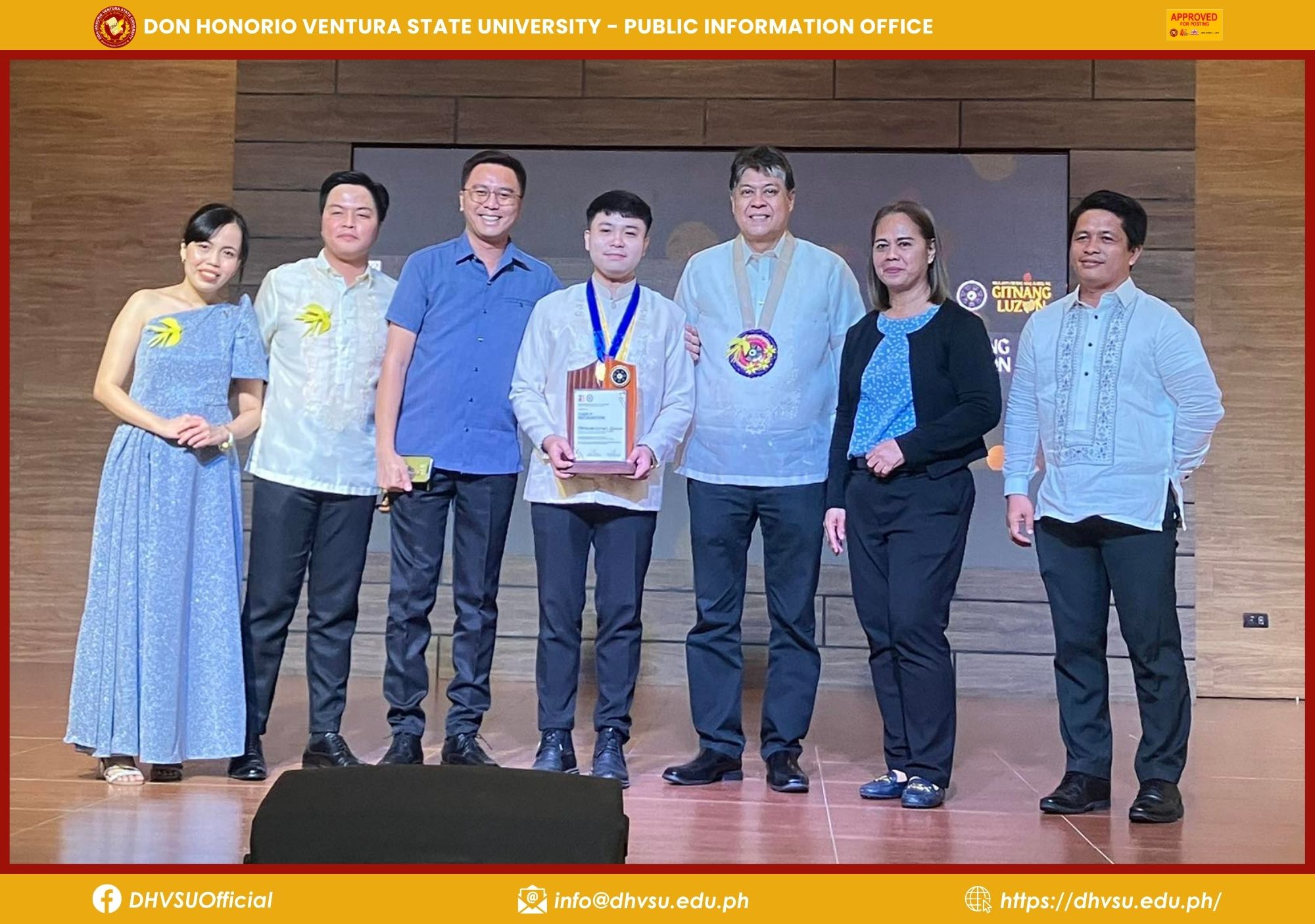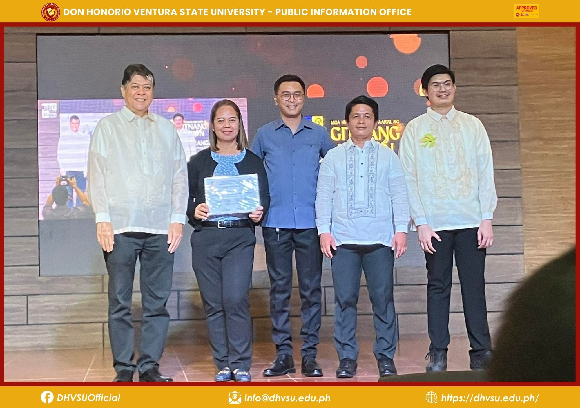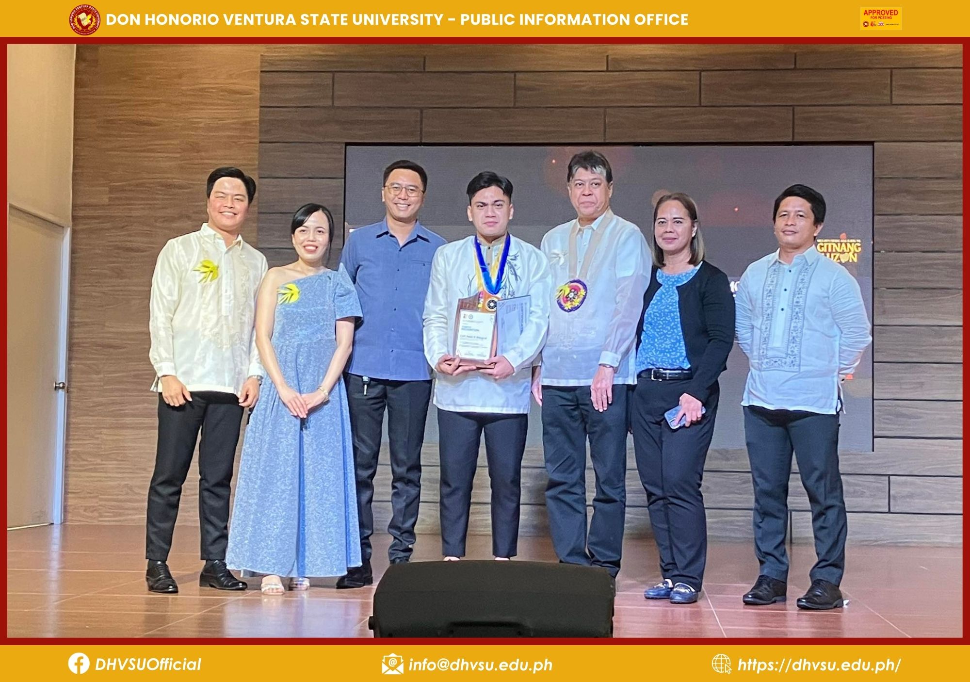 Accompanying the DHVSU finalists were Dr. Gloria Gigante, Director for Student Affairs, Mr. Christopher Sicat, representative from the Mexico Campus, and Dr. Adonis David, Dean of the College of Arts and Sciences, all celebrating the achievements of the university's alumni.