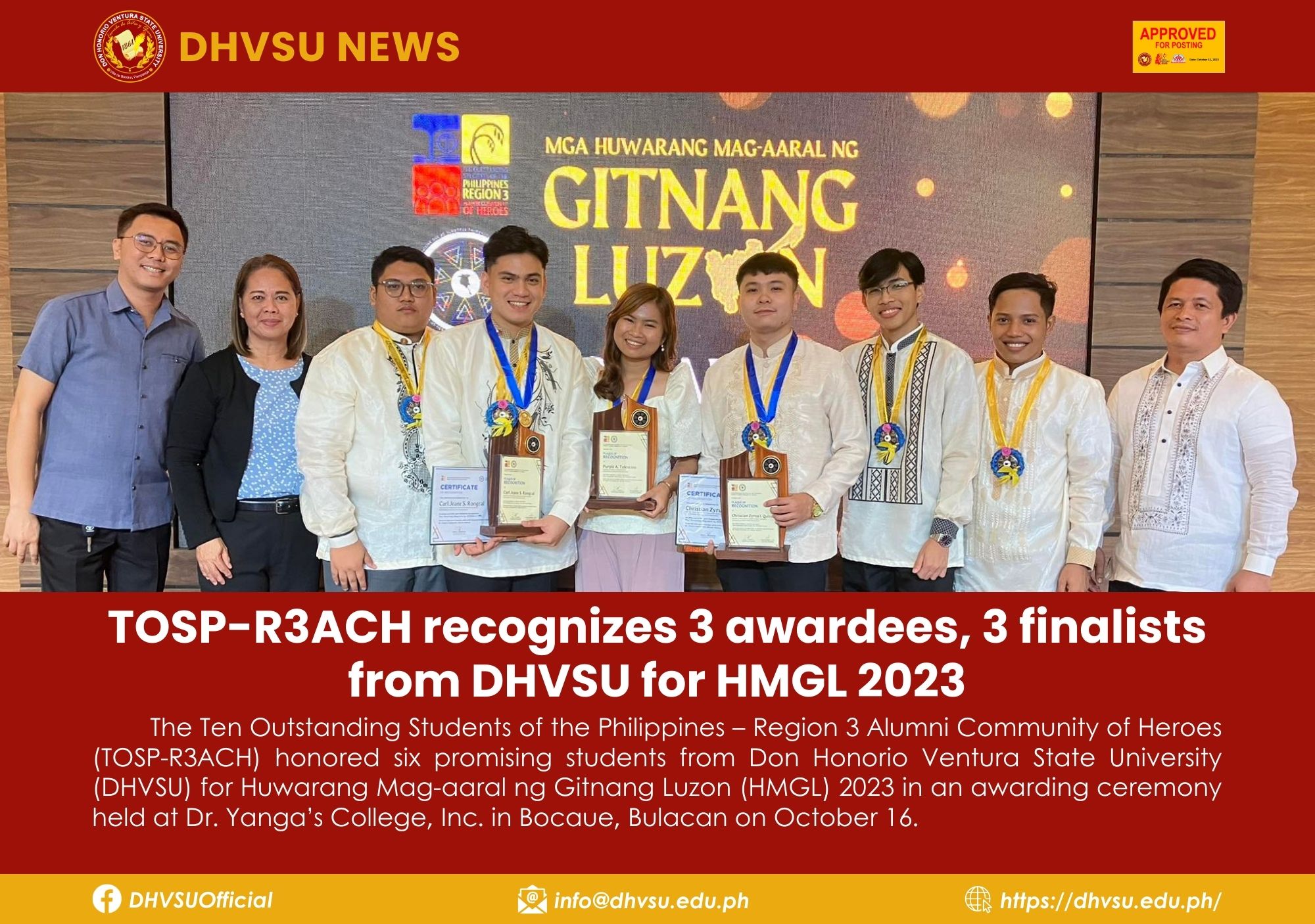 The Ten Outstanding Students of the Philippines – Region 3 Alumni Community of Heroes (TOSP-R3ACH) honored six promising students from Don Honorio Ventura State University (DHVSU) for Huwarang Mag-aaral ng Gitnang Luzon (HMGL) 2023 in an awarding ceremony held at Dr. Yanga’s College, Inc. in Bocaue, Bulacan on October 16.