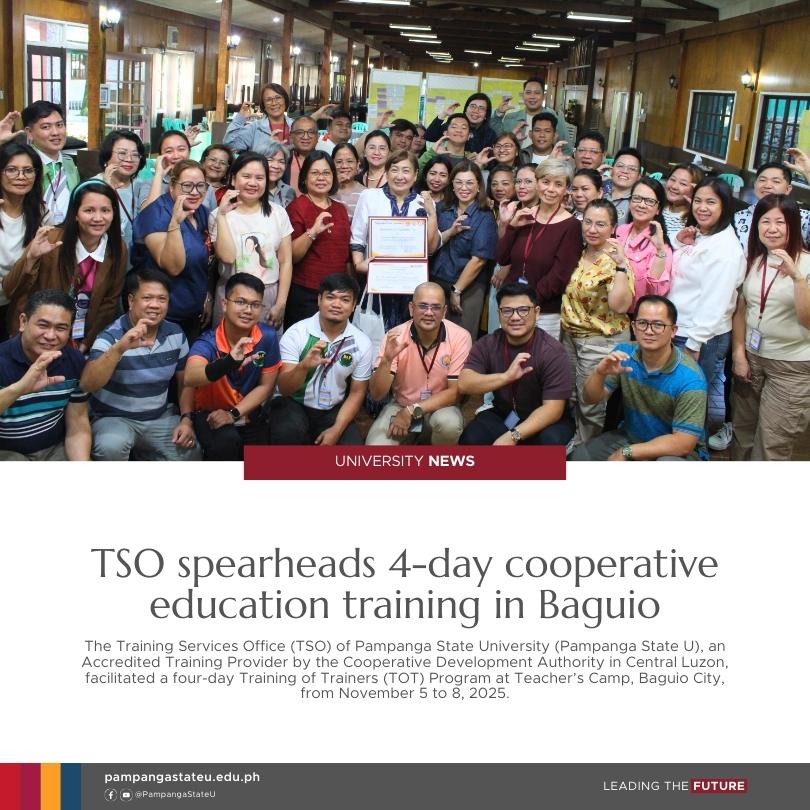 The Training Services Office (TSO) of Pampanga State University (Pampanga State U), an Accredited Training Provider by the Cooperative Development Authority in Central Luzon, facilitated a four-day Training of Trainers (TOT) Program at Teacher’s Camp, Baguio City, from November 5 to 8, 2025.