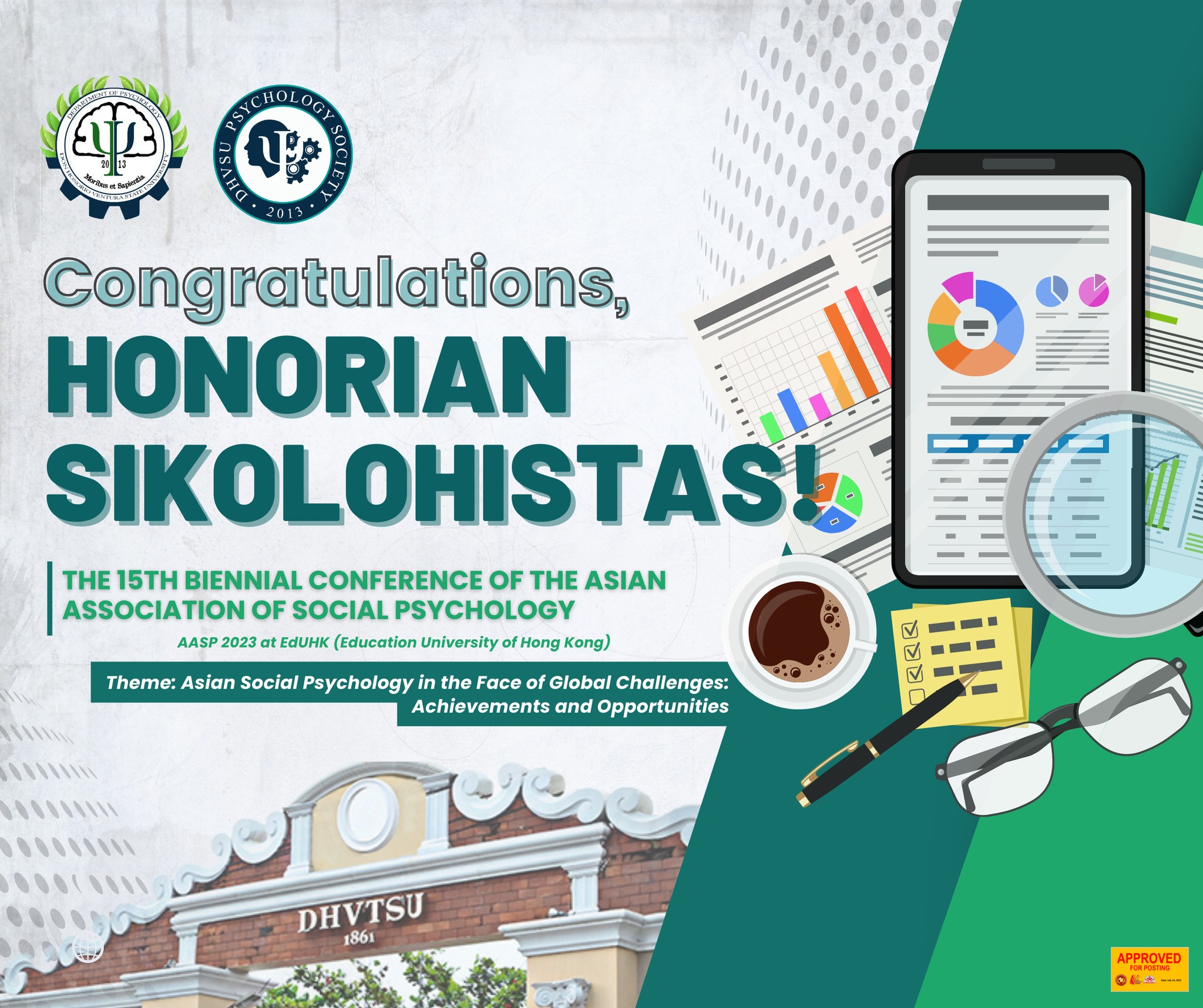 The DHVSU Psychology Society proudly presents the two group presenters from DHVSU 4th year BS in Psychology students of the College of Social Sciences and Philosophy (CSSP) who joined the 𝟏𝟓𝐭𝐡 𝐁𝐢𝐞𝐧𝐧𝐢𝐚𝐥 𝐂𝐨𝐧𝐟𝐞𝐫𝐞𝐧𝐜𝐞 𝐨𝐟 𝐭𝐡𝐞 𝐀𝐬𝐢𝐚𝐧 𝐀𝐬𝐬𝐨𝐜𝐢𝐚𝐭𝐢𝐨𝐧 𝐨𝐟 𝐒𝐨𝐜𝐢𝐚𝐥 𝐏𝐬𝐲𝐜𝐡𝐨𝐥𝐨𝐠𝐲 (AASP). The said conference of the AASP 2023 was organized and held in Hong Kong in hybrid mode by the Department of Psychology at the Education University of Hong Kong from July 13-15, 2023.